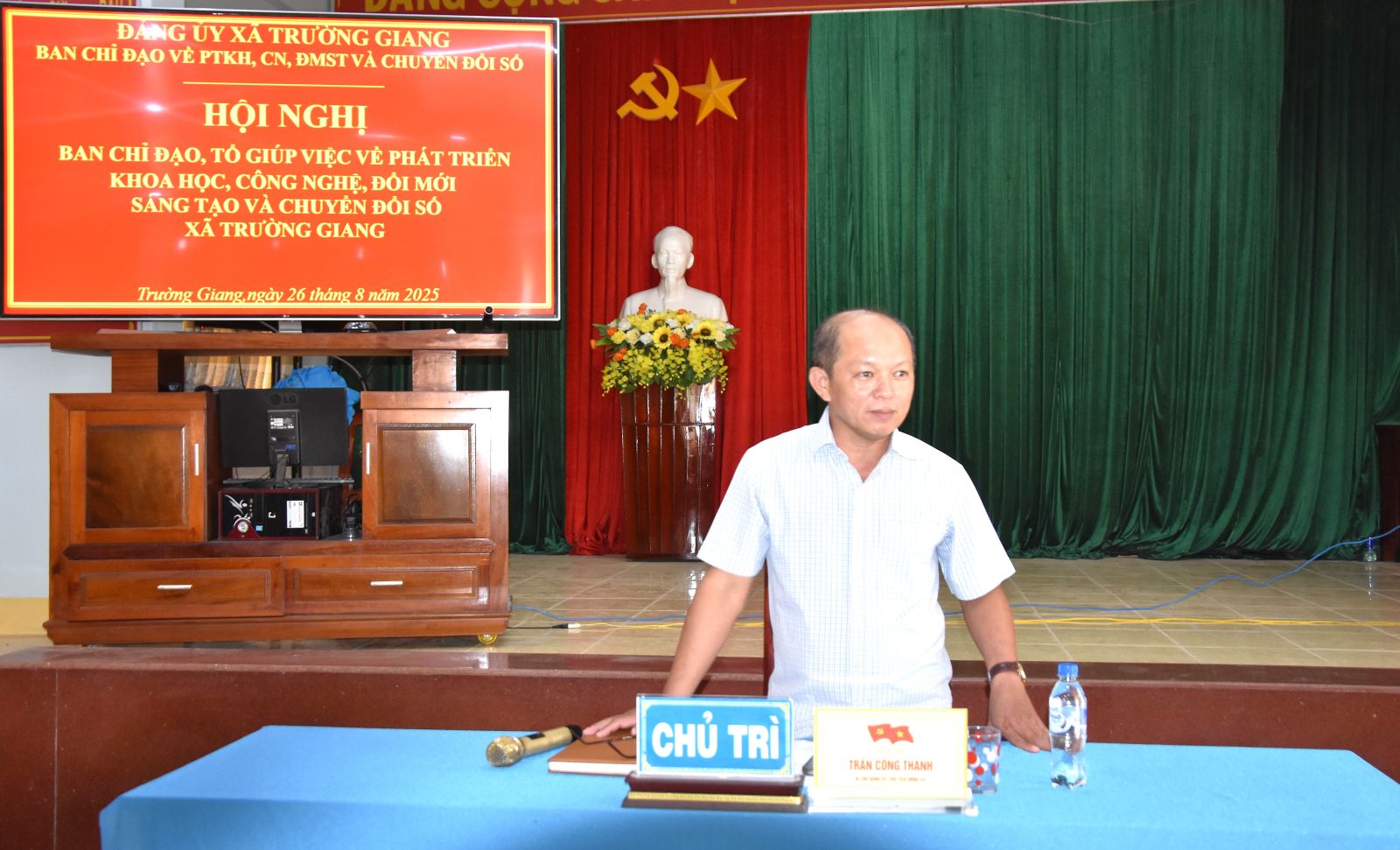 Chiều ngày 26/8/2025, tại Hội trường Đảng ủy xã Trường Giang, Ban Chỉ đạo về phát triển khoa học công nghệ, đổi mới sáng tạo và chuyển đổi số xã Trường Giang tổ chức Hội nghị triển khai nhiệm vụ. Đồng chí Trần Công Thành – Bí thư Đảng ủy, Chủ tịch HĐND xã, Trưởng Ban Chỉ đạo chủ trì Hội nghị.